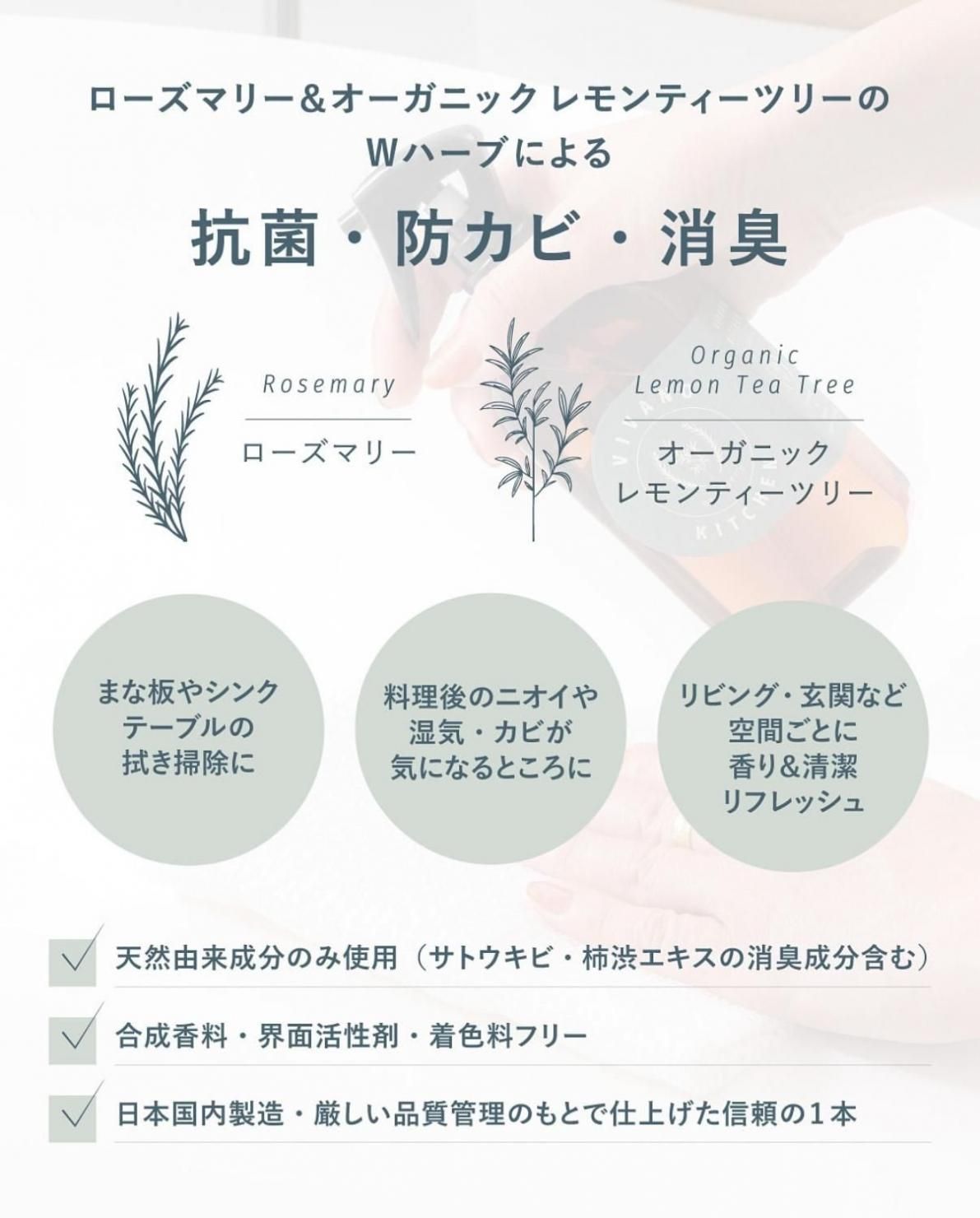 ▶ローズマリー&オーガニック レモンティーツリーの競演。機能性のみならず、調香師が香りのレイヤーまでもこだわり生まれた除菌スプレー。口に入るまのを扱う場所だからこそ、天然由来成分のみを使用した、安心の処方です。