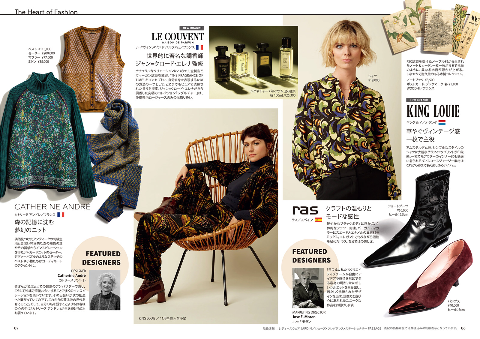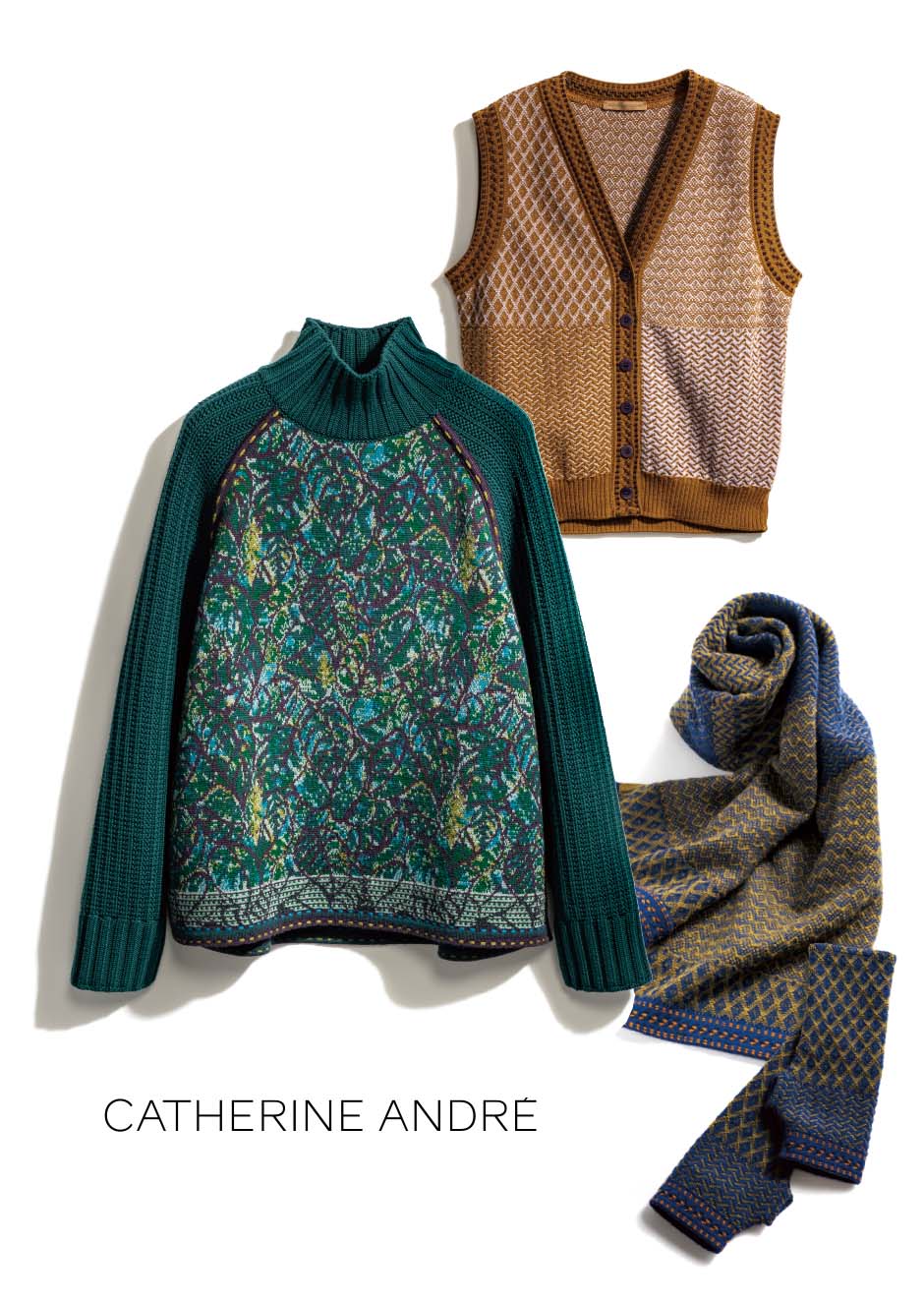 偶然見つけたアンティークの刺繍生地と奥深い神秘的な森の植物の葉やその質感からインスピレーションを得たジャカードニットのセーター。ジグソーパズルのようなステッチのベストや小物たちはコーディネートのアクセントに。