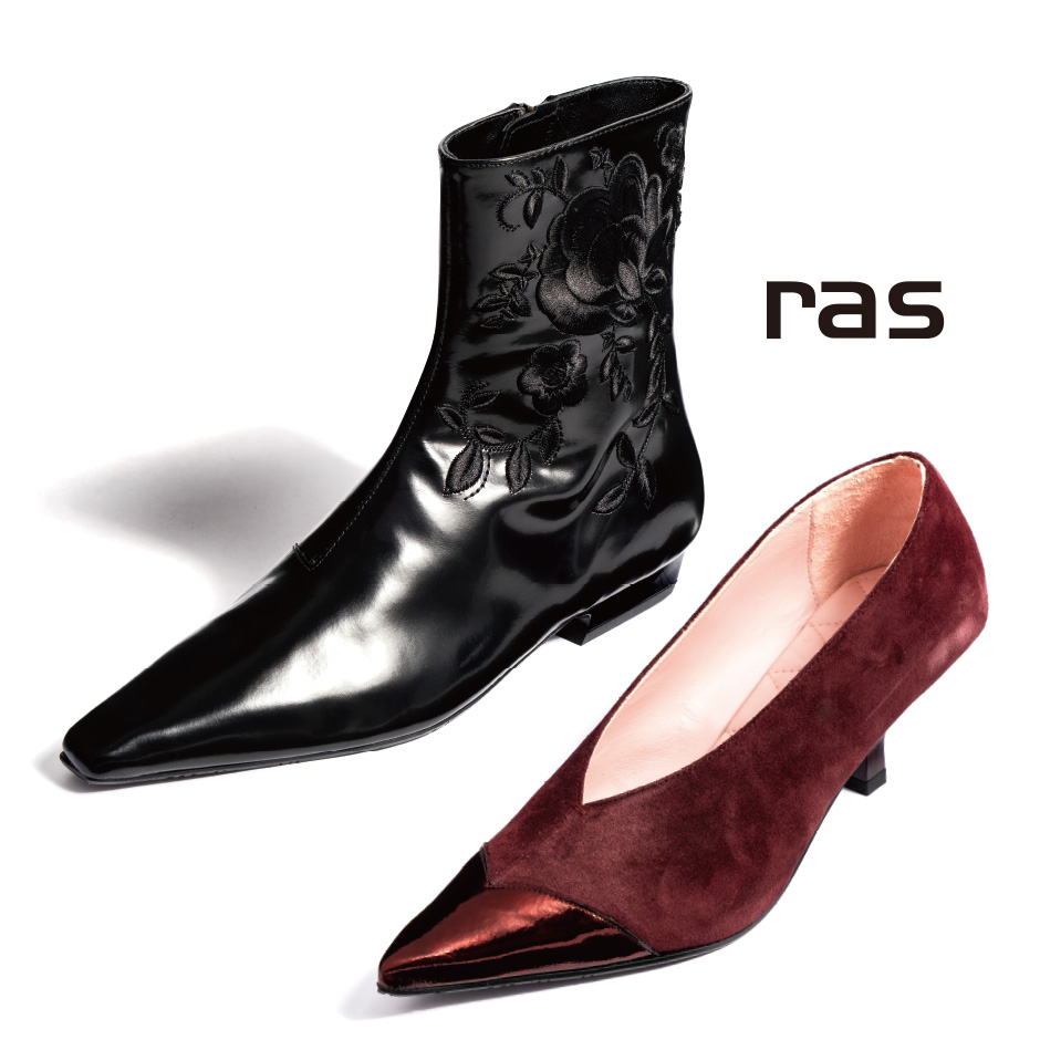艷やかなブラックボディに浮かぶ、立体的なフラワー刺繍。バーガンディカラーにスエードとエナメルの異素材をミックス。エレガントでありながら個性を秘めた「ラス」ならではの美しさ。