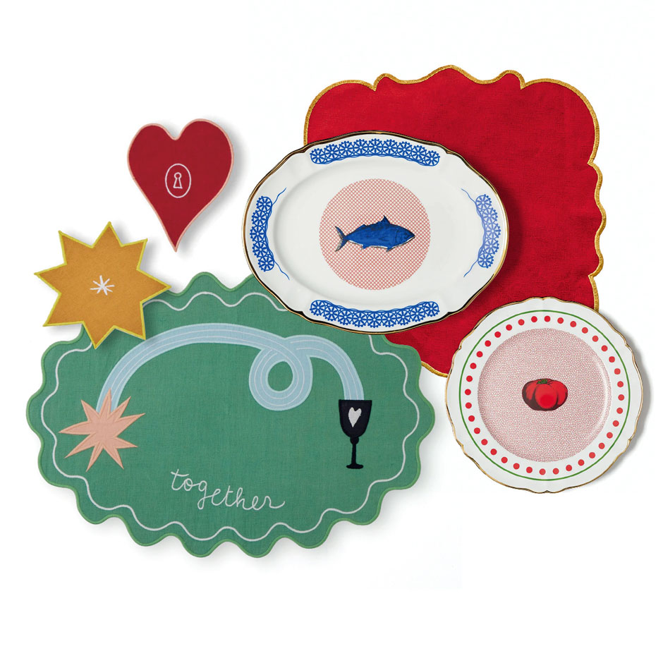 喜びに満ちた未来、ポジティブなパワーを追求するアーティスト達が描く、ポップなシルエットのテーブルアイテムはパーティーシーンをより盛り上げる。