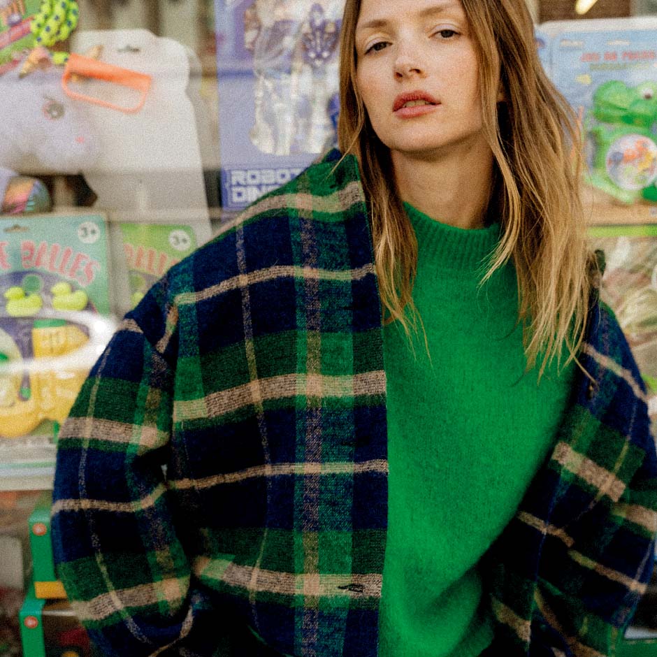ザクロモチーフの刺繍がアクセントのストライプシャツはボーイッシュなボックスフィットのショート丈でフレッシュな印象。イタリアで織られるウールとアルパカの混紡素材を用いたジャケットは着用感も配色もあたたか。