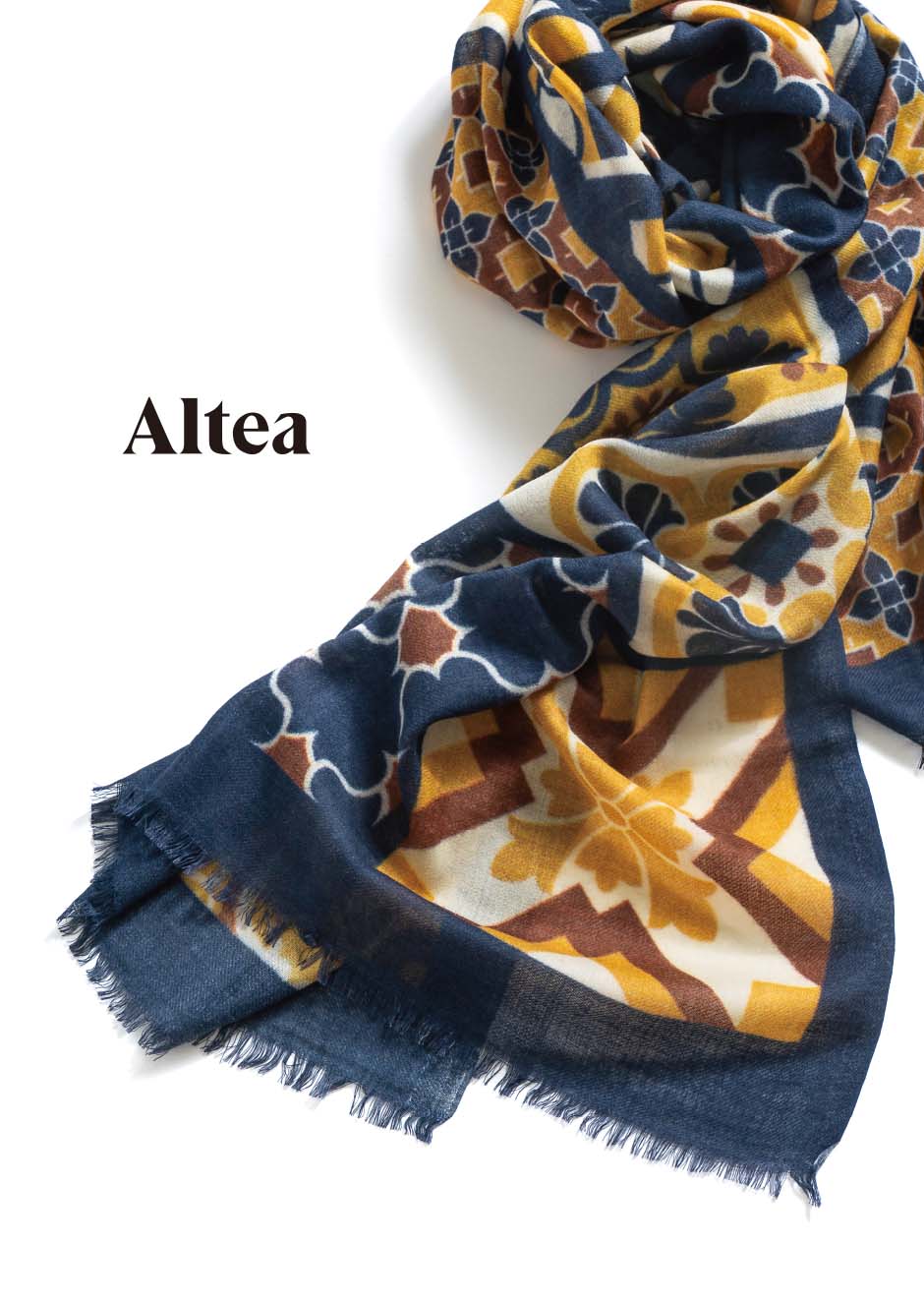 ブロックごとにデザインが変化するストールは、巻き方によって表情を変える善美の極み。「巻く」が心弾ませる一枚。